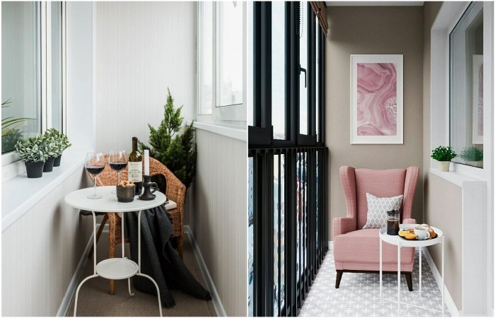 Чтобы на балконе хотелось проводить как можно больше времени в тишине и покое, необходимо создать здесь правильную атмосферу. А начать нужно с банального – грамотно подобранной мебель. Если помещение не отличается большими габаритами или планировка узкая и вытянутая, самым лучшим решением будет установить здесь кресло и кофейный столик, которые займут минимум места. А в качестве декора подойдет небольшой коврик – тогда ноги точно не будут мерзнуть зимой.