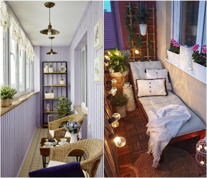 Так как осенью и зимой темнеет рано, очень важно позаботиться о том, чтобы на балконе было отдельное освещение – света из прилегающей комнаты, скорее всего, не хватит, и пространство будет казаться неуютным. В этом вам помогут настольные лампы, настенные бра на батарейках. Для чтения идеальным вариантом станет торшер, который можно удобно разместить рядом с креслом, а для создания романтичной атмосферы подойдут электрические свечи и гирлянды. Обратите внимание, что лампочки должны быть с теплым свечением, иначе вам будет некомфортно находиться на балконе.
