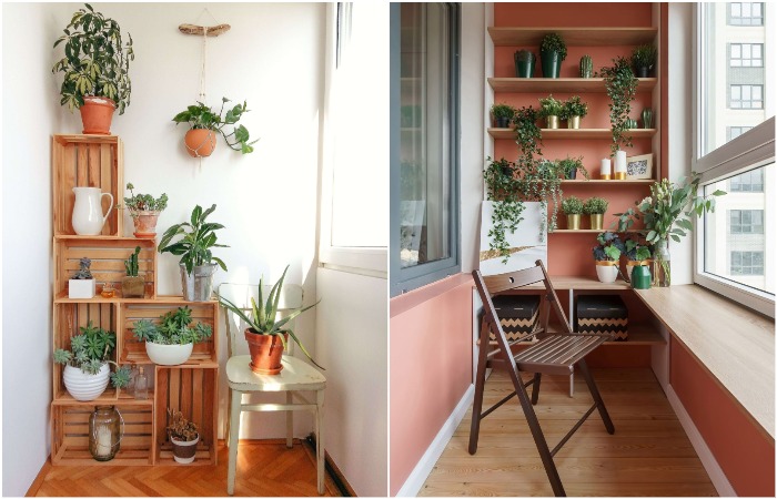 Цветы можно расставить на подоконнике, поставить на полку или стеллаж, а если есть большое растение в горшке, то оно будет прекрасно смотреться в углу на полу, например, возле кресла. Также дизайнеры рекомендуют использовать для декора подвесные кашпо, но если не хочется проделывать отверстие в потолке, эта идея точно вам не подойдет. Не забывайте наблюдать за состоянием растений – возможно, среди них есть особо теплолюбивые, и условия балкона не подойдут для выращивания. Поэтому если вы заметили, что листья начали желтеть и скручиваться или увидели другие признаки «болезни», перенесите цветы в другую комнату, где температура выше.