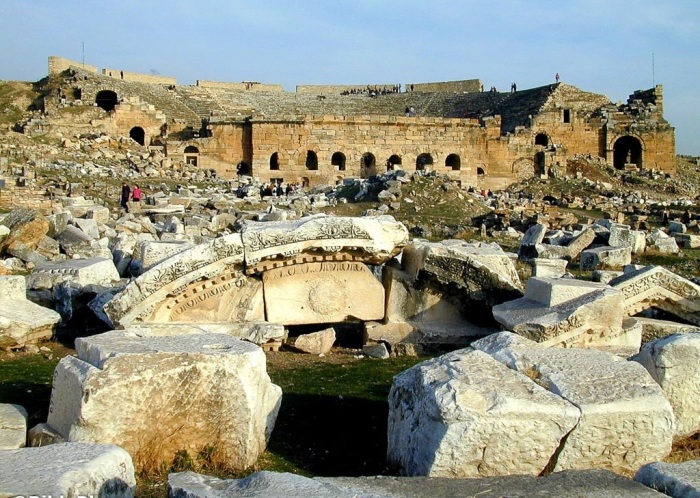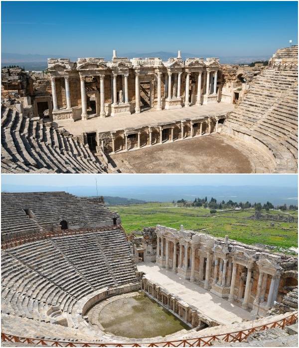 Амфитеатр Иераполиса является одним из наиболее хорошо сохранившихся театральных сооружений античности. Построенный древними римлянами во втором веке нашей эры, огромный общественный комплекс был местом проведения масштабных представлений, театральных/музыкальных постановок, различных соревнований и общегородских праздников, включая религиозные обряды. Театр построен на склоне холма и имеет три уровня сидений. Сценическая площадка находится у подножия холма и окружена портиком с колоннами. Исполнители использовали несколько комнат за сценой, а вот часть для зрителей предусматривает 45 рядов сидений, которые вмещали до 15 тыс. зрителей, где особо выделяется центральная зона, предназначенная для повелителя, священников, специальных гостей и высокопоставленных чиновников. Кстати сказать, сцена в основном оригинальная, а вот изваяния являются копиями древних скульптур, фрагменты которых теперь хранятся в Археологическом музее Иераполиса, находящемся на территории комплекса.