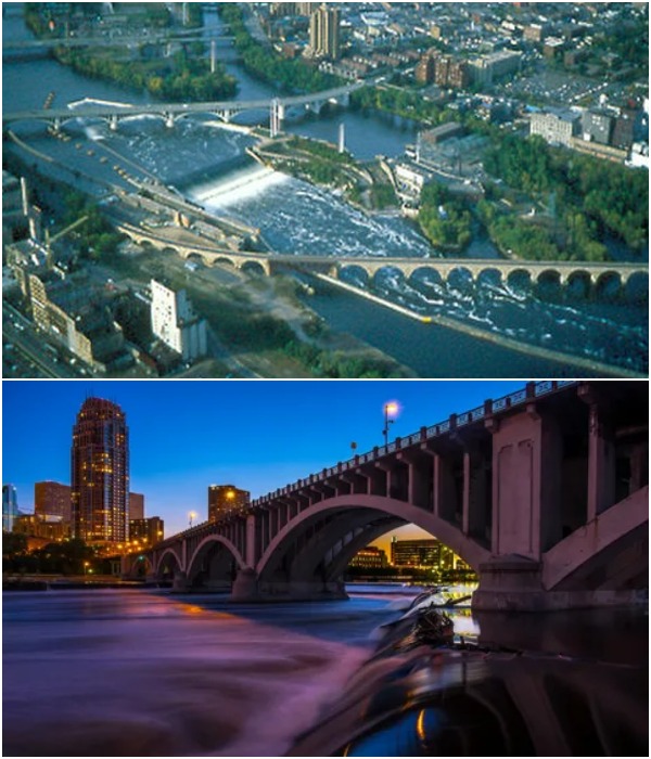 Новый мост Сент-Энтони-Фоллс был построен всего за 11 месяцев, что позволило восстановить движение после обрушения старой переправы (Миннеаполис, США). | Фото: nara.getarchive.net.