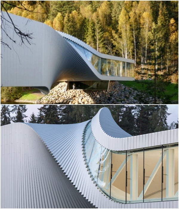 Музей-мост The Twist имеет экстравагантную конструкцию, покрытую алюминием, она повернута на 90 градусов (Евнакер, Норвегия).