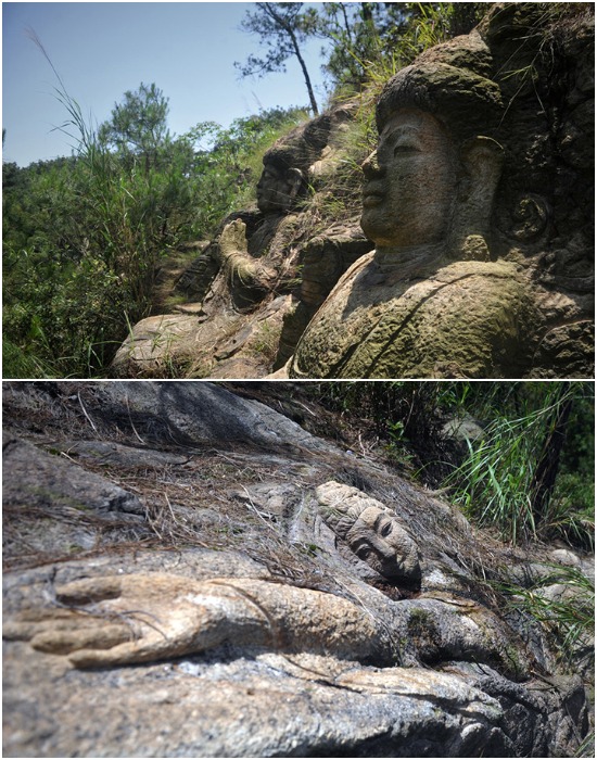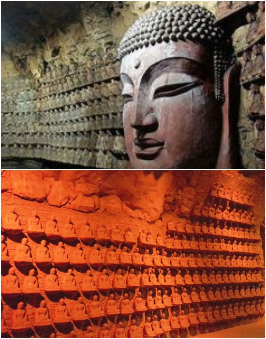 Древние каменные изваяния, вырезанные из камня монахами-буддистами более 1,4 тыс. лет назад (Mountains of a Thousand Buddhas Park, Китай). | Фото: baike.baidu.com.