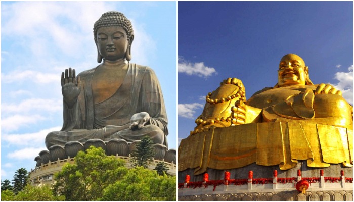 Пример Будды, как конкретной исторической личности, и добряка-будды, приравненного к божеству, достигшему просветления (Парк тысячи Будд, Китай). Примечательно: Согласно правилам русского языка, написание слова «Будда» с заглавной буквы, говорит о том, что речь идет о конкретной исторической личности — Сиддхартхе Гаутаме, представителе знатного рода Шакьев, принадлежавшего к сословию правителей и воинов. В остальных же случаях, определение слова «будда» применимо ко всем божествам/существам, которым удалось обрести «высшее состояние духовного совершенствования» и достигли просветления (бодхи). Отсюда и различное изображение будд на статуях или барельефах, которые могут иметь обличие мифических существ, необычные пропорции человеческого тела, чаще мужского, хотя среди десятков будд и бодхисаттв встречается и женский пантеон.