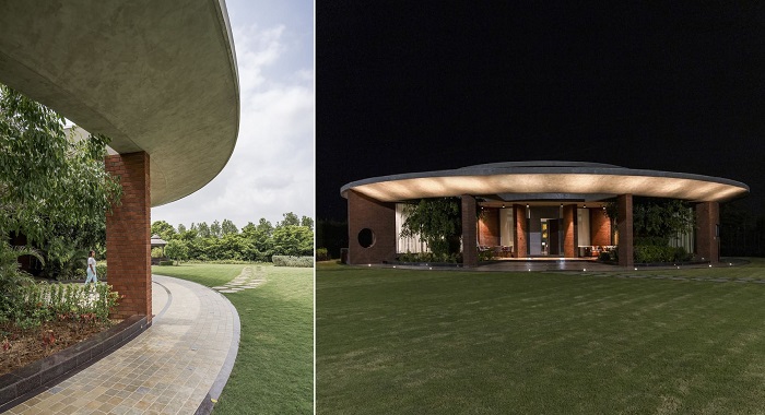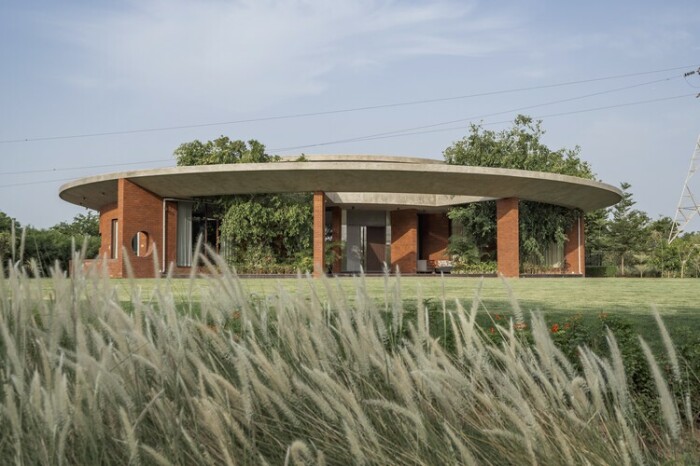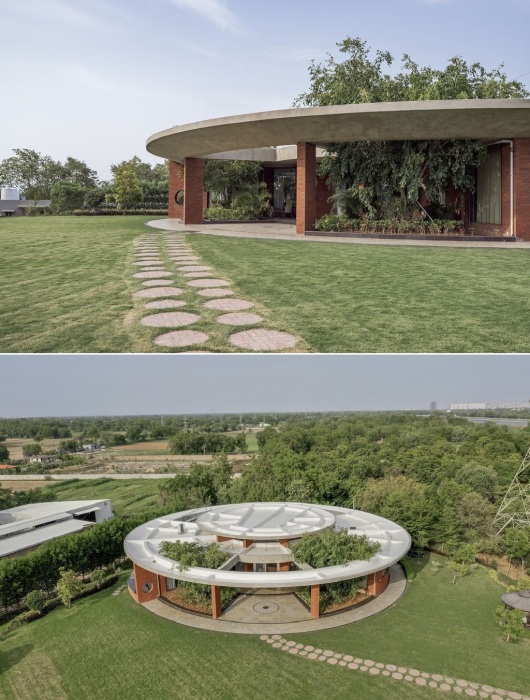 В безмятежном северном пригороде Ахмадабада, известном как Джаспур, появилась оригинальная загородная резиденция под названием «Кольцевой дом», в конструкции и форме которой идеально сочетается архитектура и колоритная природа западной части Индии. Построенный для большой семьи, привыкшей отдыхать всем составом (14 человек, сразу три поколения), довольно большой жилой дом, окруженный бескрайними сельхозугодьями и пышной манговой рощей, органично вписался в окружающую среду. При этом разработчики проекта в первую очередь позаботились о сохранности биоразнообразия на участке.
