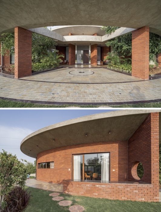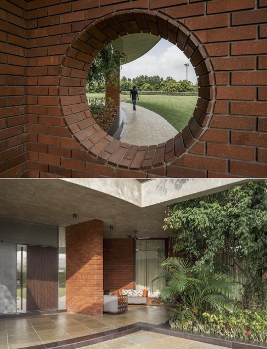 Главными материалами для строительства дома были выбраны современный бетон и красный кирпич местного производства (The Ring House, Индия).