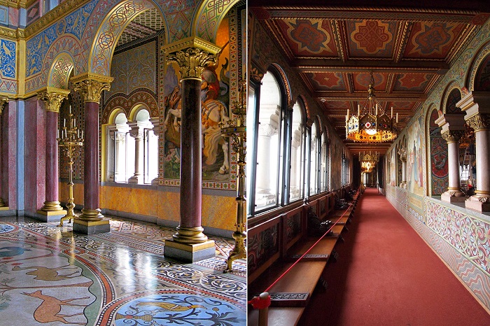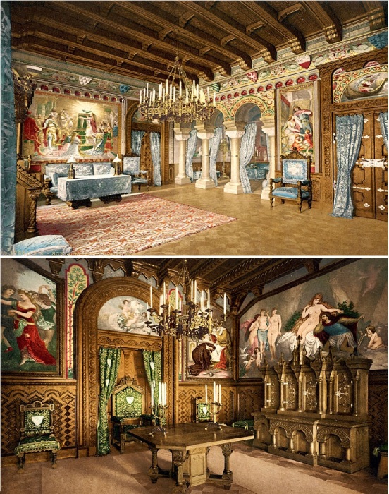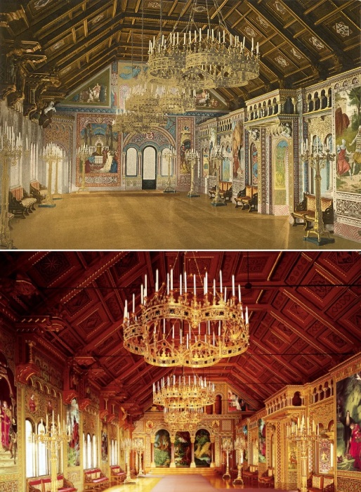 Зал певцов, посвященный творчеству Рихарда Вагнера, был одним из самых важных помещений в Schloss Neuschwanstein (1896 г. и современное фото).