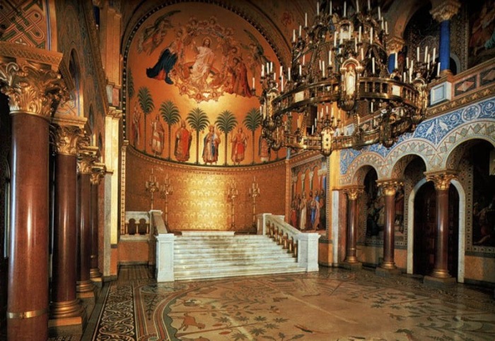 Чего только стоит смешение архитектурных стилей, придающих замку неповторимый характер, да и дизайн самих помещений. Каждая из оформленных комнат украшена гобеленами, шелками, драпировками, изделиями из дерева, скульптурами и фресками, изображающими яркие эпизоды средневековых литературных легенд, скандинавской мифологии, известных произведений поэтов Баварии. Темы любви, искупления, вины и спасения заполняют все без исключения комнаты, демонстрируя идеалы короля, передавая их смысл через искусство. Стоит отметить, что двухэтажный тронный зал с его золотым куполом, шестиметровой золотой люстрой, лазуритовыми колоннами и арками в византийском стиле, считается самым впечатляющим и неординарным вариантом оформления такого рода помещений. В продолжение темы средневековых замков и рыцарской эпохи, предлагаем заглянуть в храмы, крепости и замки, построенные крестоносцами в разных уголках Европы.