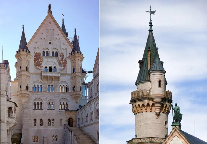 Интерпретация средневекового фасада из белого известняка Нойшванштайна с синими башенками послужила вдохновением и моделью для замка в диснеевской «Спящей красавице» (Бавария).